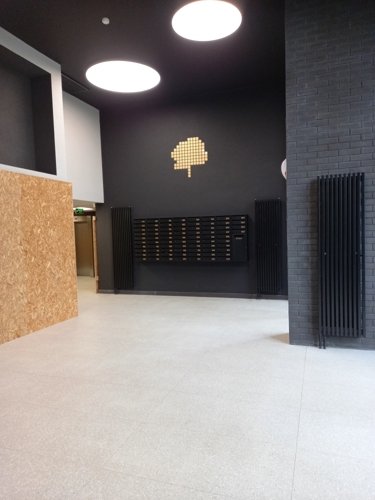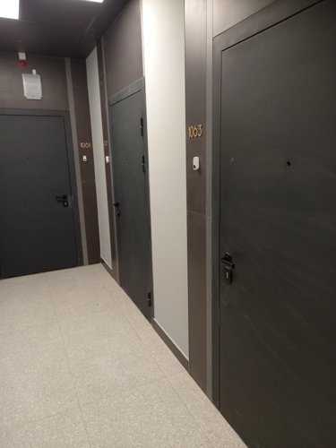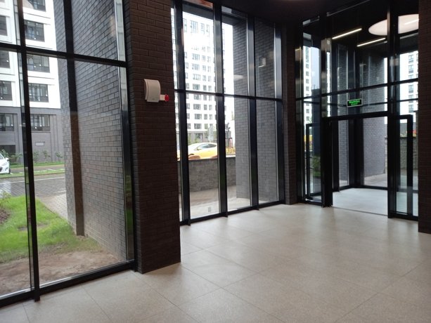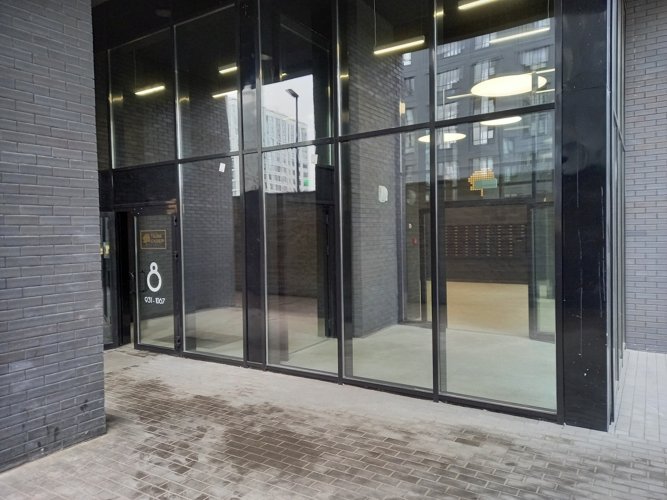 Входы в парадные оформлены в виде огромных витрин, за которыми Вас встречают стильные тёмные стены. рядом со входами расположены достаточно крупные колясочные, а в лифте вы поднимаетесь с музыкальным сопровождением.