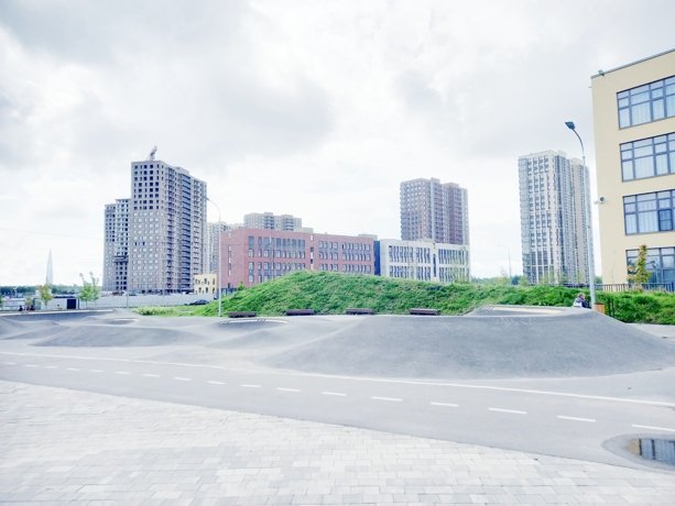 В то же время здесь лесная дорога рядом, беседки у леса, дорожки из настилов посреди деревьев, а в ночное время они подсвечены фонарями, шатёр для йоги на свежем воздухе, лодочный причал, с которого можно плыть по реке Юнтоловка к Лахтинскому разливу - вещи, отсутствующие во многих районах города.
