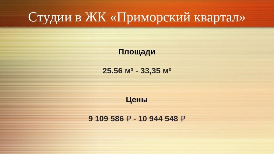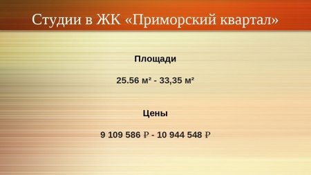 В “Приморском квартале” представлены студии, 2-, 3-, 4-комнатные квартиры площадью от 22,7 до 122,56 кв. м. В них есть такой плюс, как наличие готового стока из пластиковых труб на балконах для жидкостей из кондиционеров. Виды различны: на дворы, на церковь, на зелёные пространства Удельного парка, а с корпуса на Коломяжском проспекте можно увидеть колесо обозрения на Крестовском острове и даже небольшой кусочек залива.
