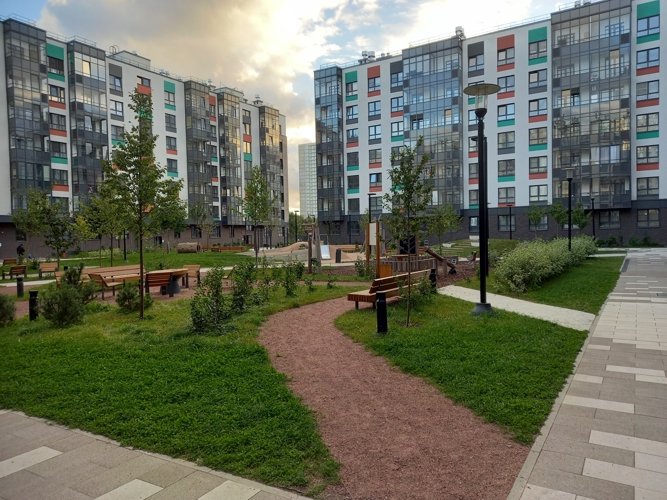 Входные группы ЖК «OKLA» — это просторные светлые холлы с большой площадью остекления с колясочными, лапомойками и туалетами. В квартирном фонде ЖК «OKLA» представлены студии и квартиры от 1 до 4 комнат, включая форматы «евро». Есть планировки с мастер-спальнями, гардеробными и двумя санузлами. Окна достаточно крупные. И если у большинства жителей семиэтажных корпусов виды на уютные дворики, то жителя “свечек” из-за отсутствия высоких зданий поблизости будут доступны потрясающие виды на леса, озеро, город.