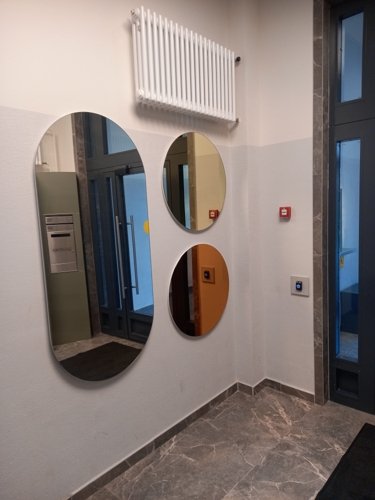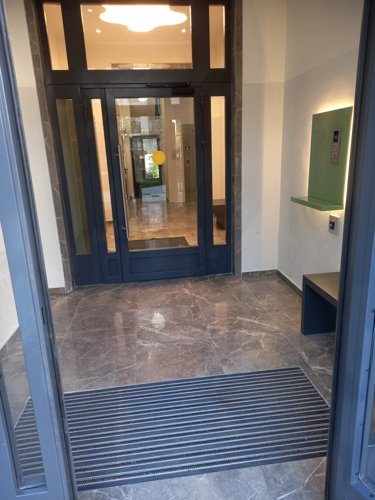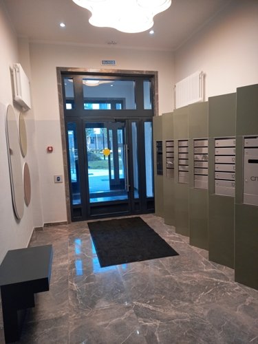Входные группы ЖК «OKLA» — это просторные светлые холлы с большой площадью остекления. Парадный вход расположен на уровне тротуара, что удобно для семей с детскими колясками и пожилых жителей. Внутри входных групп есть колясочные, лапомойки и туалеты. Пол во входных группах оформлен в виде блестящего чёрного камня, причём и в колясочных и на ступенях к квартирам первого этажа. Наверху стильные светильники. Есть стильные крупные почтовые ящики и зеркала, как для взрослых, так и для детей.